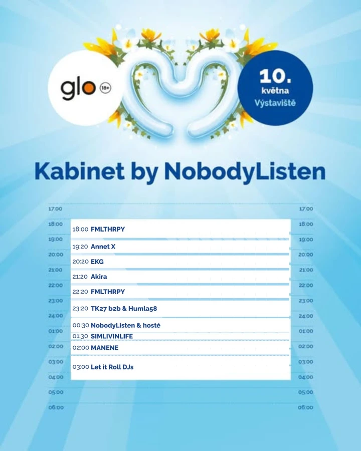 Kabinet by NobodyListen ve spolupráci s glo™ nabídne špičku domácí elektroniky: FMLTHRPY, ANNET X, EKG, AKIRA, TK27 B2B & HUMLA58, NobodyListen & hosté, Simlivinlife, Manene a DJs z Let It Roll.