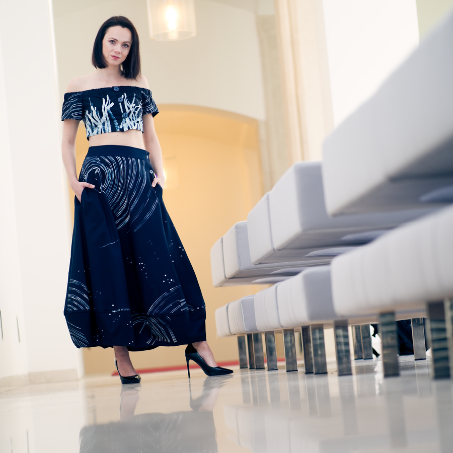 Při vytváření své kolekce se neomezuji pouze na malbu na hedvábí. Pro mne je důležitá i tradice, a proto si vytvářím vlastní autorský modrotisk, barvený ve Strážnici v tradiční dílně modrotisku. Každý model tak ožívá historickým šarmem, který zdůrazňuje moji oddanost řemeslnému umění.