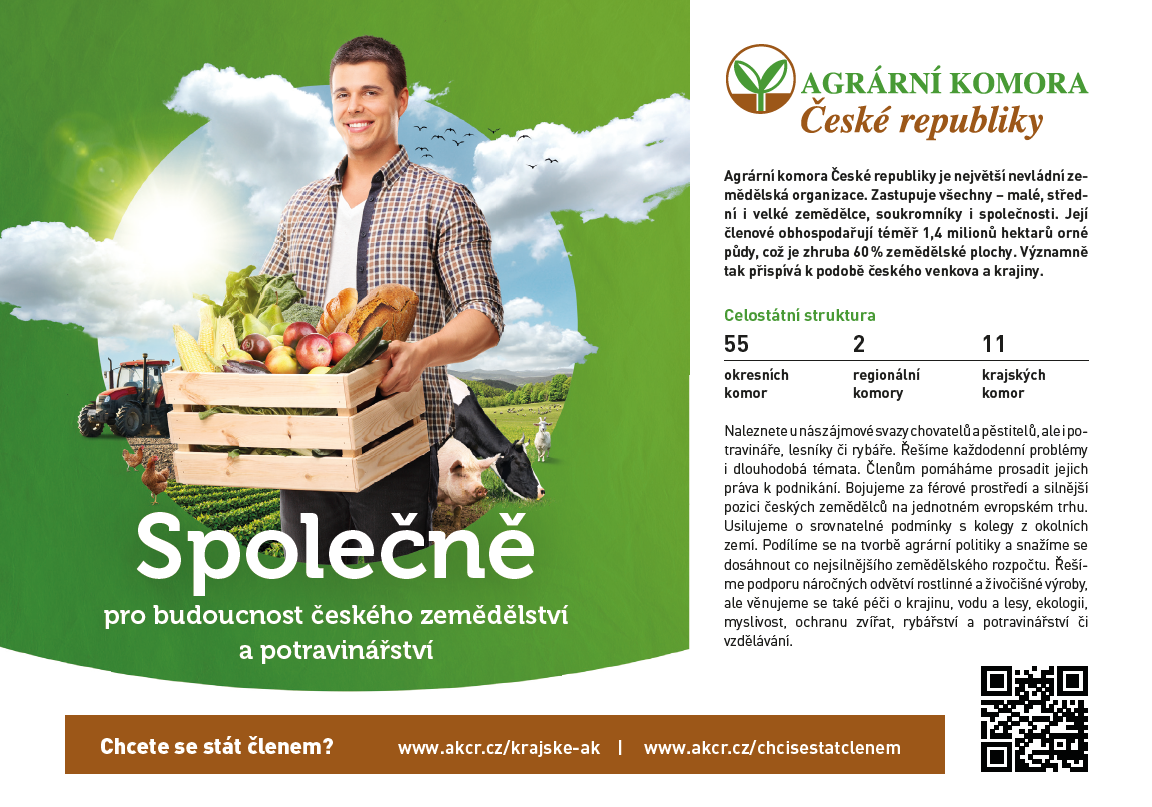 Agrární komora České republiky již více než 30 let zastupuje většinu podnikatelů v zemědělství, lesnictví a potravinářství. Naši členové produkují přes 80 procent veškeré zemědělské produkce v České republice a obhospodařují přibližně 1,4 milionu hektarů zemědělské půdy.