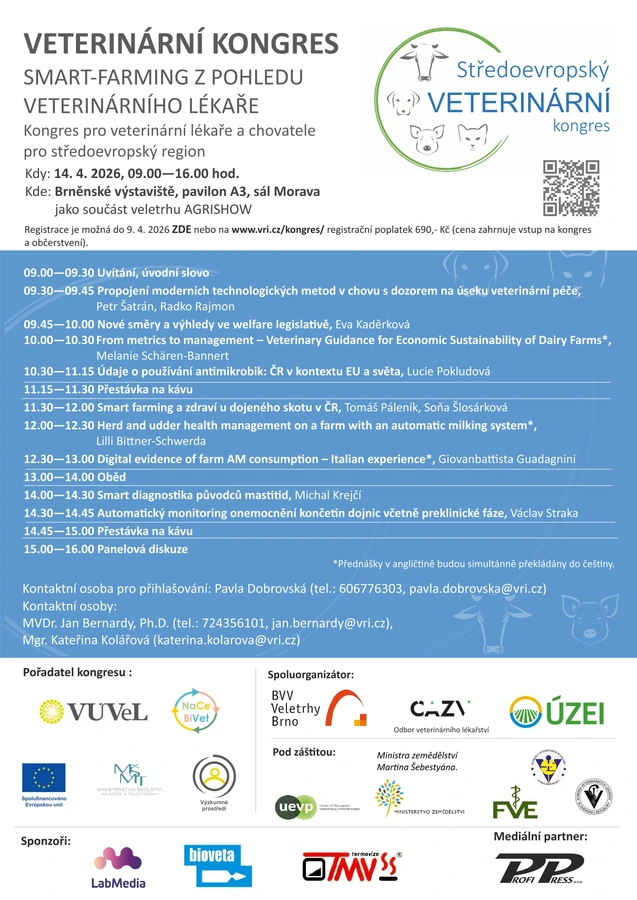 Jedním z vrcholů doprovodného programu Národní výstavy hospodářských zvířat 2026 bude Středoevropský veterinární kongres, který proběhne 14. dubna 2026 v sále Morava na brněnském výstavišti. Akce tradičně propojí odborníky z praxe, akademické sféry i zástupce firem působících v oblasti veterinární péče, welfare a moderních technologií v chovu hospodářských zvířat.