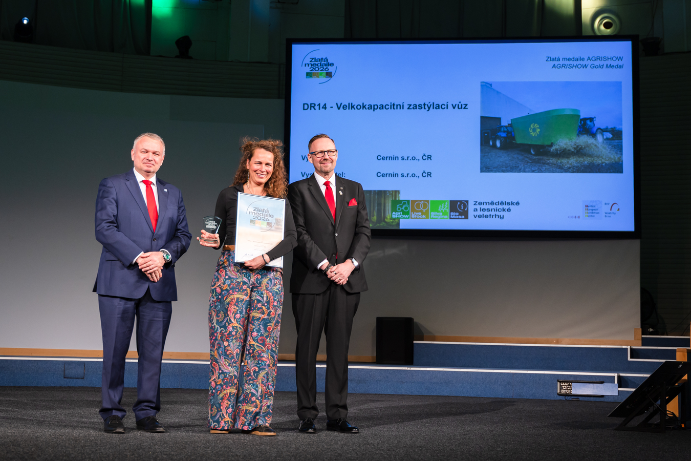 Zlatou medaili AGRISHOW 2026 si z Brna odveze i společnost Cernin. Její velkokapacitní zastýlací vůz DR14 se vyznačuje sníženou prašností a rozhoz materiálu je možné plynule regulovat až do záběru 10 metrů a rozsahu 180°. Stroj má jednoduché konstrukční řešení, které umožňuje univerzální použití.