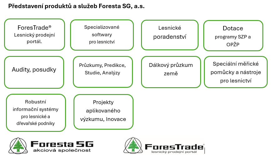 Společnost Foresta SG, a.s. působí na českém trhu již 32 let. Po celou dobu od svého vzniku se zaměřuje na poskytování širokého spektra expertních služeb a softwarových nástrojů. K tomu disponuje odborným týmem cca 40 zaměstnanců, kteří spolupracují v týmech řešících dle potřeby projekty zaměřené na lesnictví, biomasu, dřevařství a životní prostředí, doprovázené ekonomickými úlohami a tvorbou softwarových nástrojů. Součástí týmu jsou také soudní znalci, poradci akreditovaní MZe a brokeři EIP pro inovace. Mezi zákazníky patří privátní subjekty i orgány veřejné správy včetně ministerstev, velké podniky i drobní vlastníci lesů.