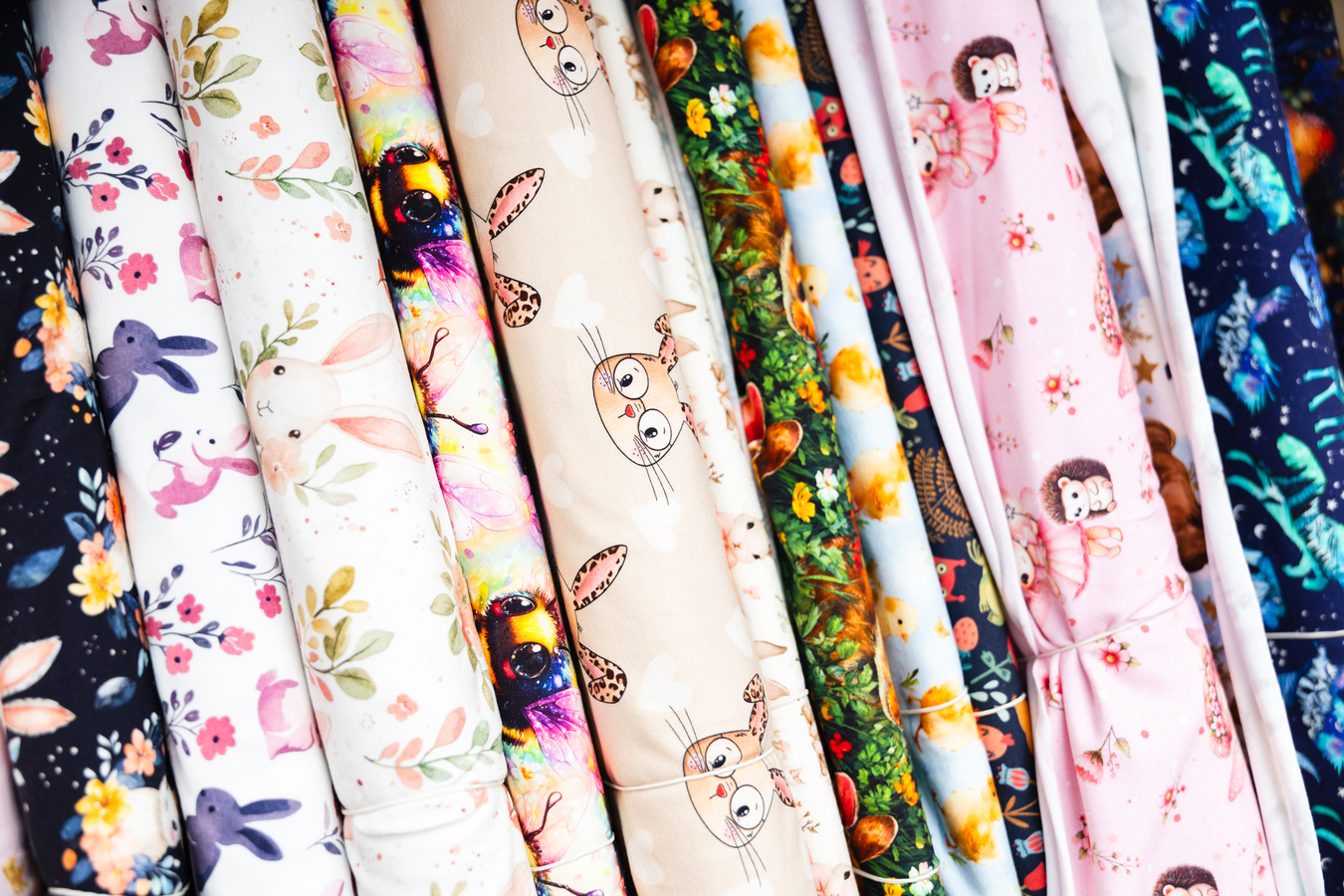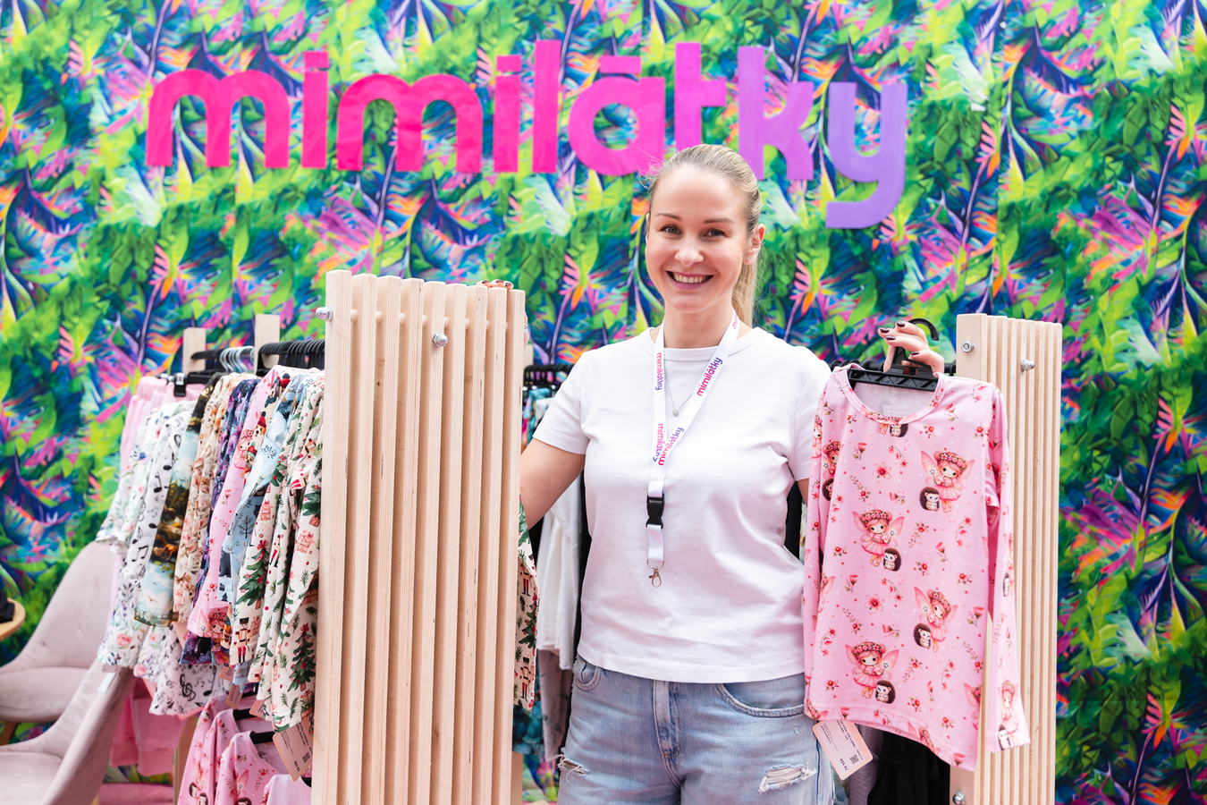 Stánek je plný barevných vzorů, které oslovují především maminky malých dětí. Dívčí motivy střídají dinosaury, zvířátka i neutrálnější designy pro kluky. Vedle samotných látek si zde návštěvníci mohou prohlédnout i hotové výrobky – například čepičky, oblečení nebo drobné doplňky. „Pokud někdo nechce šít, může si od nás odnést oblečení, doplňky, či jen malý suvenýr nebo něco hezkého pro radost,“ vysvětluje Miriam Chytilová.