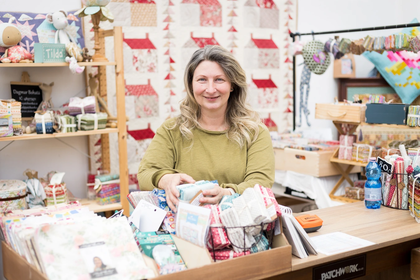 „Nejvíce se specializuji na prodej předřezaných sad, které nakupuji od Moda Fabrics z Ameriky. Právě v těchto sadách mohou zákaznice najít neuvěřitelně pestrou škálu barev a designů,“ vysvětluje Dagmar Bohatá. Postupně se však její nabídka rozšířila i o metráž. „Některým látkám se prostě nedá odolat,“ říká s úsměvem. Sama si vybírá především designéry, kteří jí jsou blízcí. „Oblíbila jsem si například French General od Moda Fabrics nebo designéry Tři sestry. Z jiného módního domu, Henry Glass, mám ráda Kim Diehl, která pracuje s neuvěřitelně jednoduchými motivy. K těmto kolekcím bývají často zdarma i návody na deky, takže zákazník má všechno pohromadě a může se do šití pustit co nejjednodušeji.“