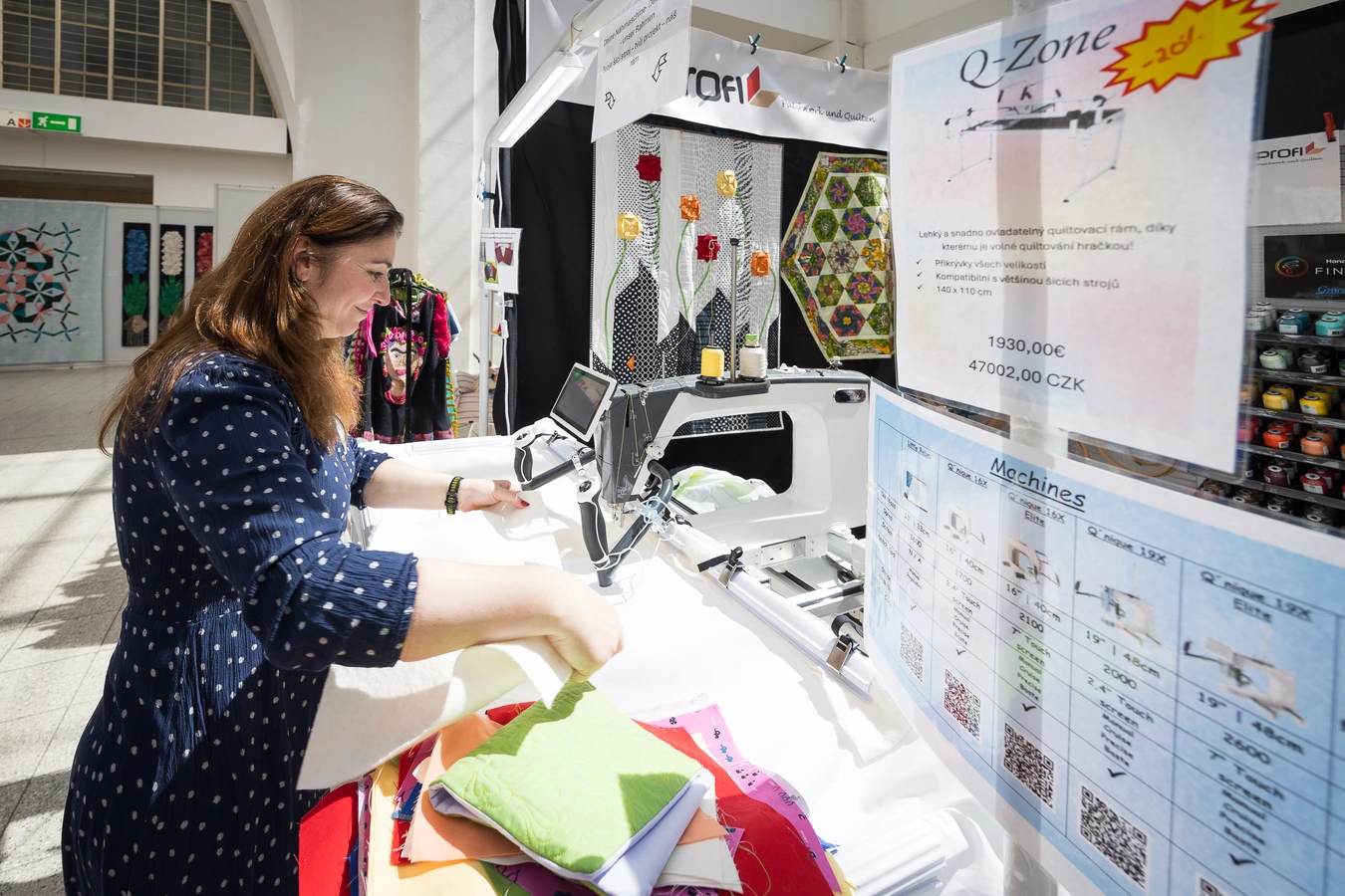 „Reprezentujeme firmu Grace Company, která vyrábí quiltovací stroje a quiltovací rámy. Letos jsme připravili něco nového – každý, kdo k nám přijde, si může přímo na rámu vytvořit vlastní obal na sešit nebo knížku, celý proquiltovaný, a odnést si ho domů. Nechtěli jsme, aby si lidé stroje jen vyzkoušeli pár tahy na látce a odešli. Chtěli jsme, aby si odnesli zážitek i hotový výrobek,“ vysvětluje Jana Verešová.