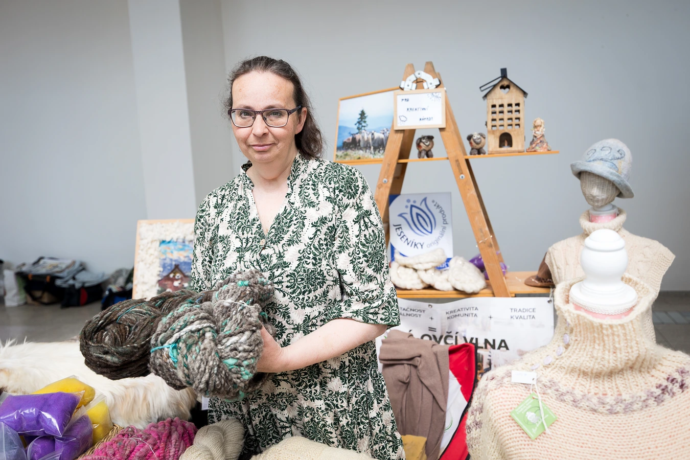 Na Brno Patchwork Meeting letos zaujala expozice spolku Stránské z.s., pod kterým vznikla malá přádelna s poetickým názvem Jesenické vlnění. Za celým projektem stojí Vladimíra Křenková a její manžel, kteří propojují chov ovcí, zpracování vlny i výrobu originálních textilních produktů přímo z Jeseníků. „Máme tady vlnu pro úsměv, vlnu pro kreativní nápady a vlnu pro teplo domova,“ říká s úsměvem Vladimíra Křenková. A právě tato věta nejlépe vystihuje celý jejich stánek – od surové vlny přes česance až po hotové výrobky, které si návštěvníci mohou odvézt domů.