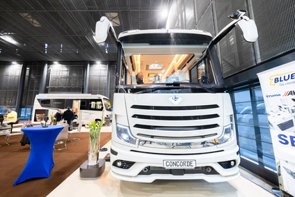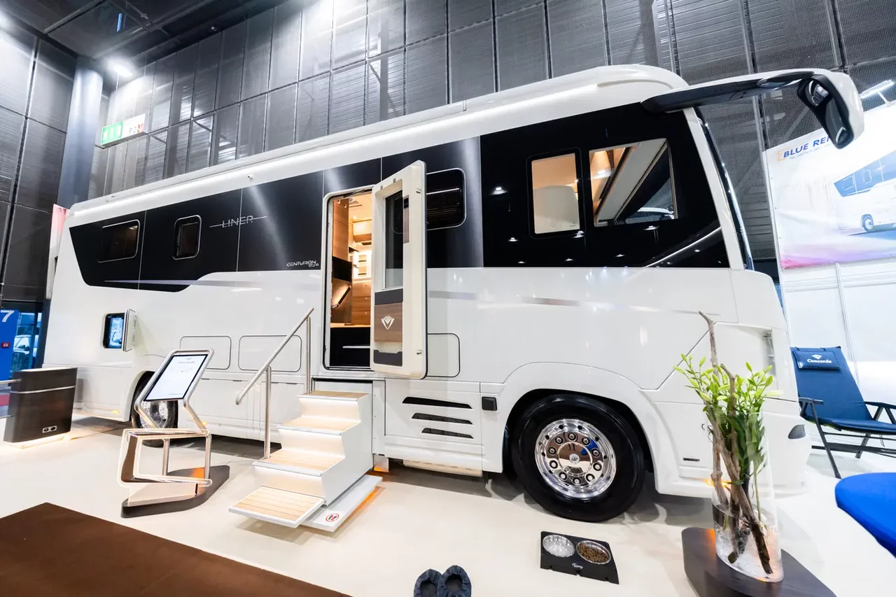 V luxusní hale V návštěvníci obdivují čtyři obytné vozy značky Concorde, z nichž největší pozornost budí novinka Liner 990 GI – majestátní vůz o hmotnosti 18 tun s garáží pro malé auto nebo motorku. „Je to úplná novinka,“ vysvětluje Filip Guryča. „Dřív se tyto modely vyráběly v délkách kolem 11 nebo 12 metrů, ale tenhle je kratší – přitom nabízí všechen komfort, na jaký jsou zákazníci Concordu zvyklí.“