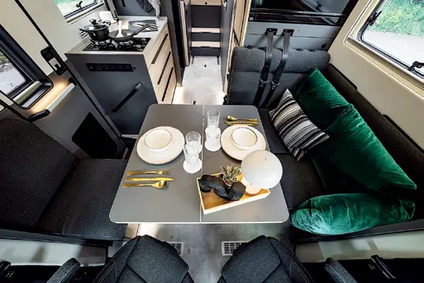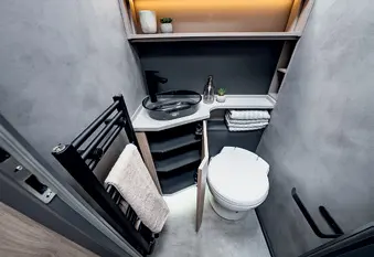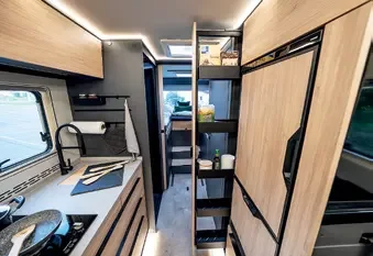 Interiér spojuje luxusní materiály, LED osvětlení a chytré detaily. Nový systém schodů se zábradlím, variabilní jídelní kout a přepracovaná koupelna typu Roombath s wellness sprchou posouvají komfort na novou úroveň.