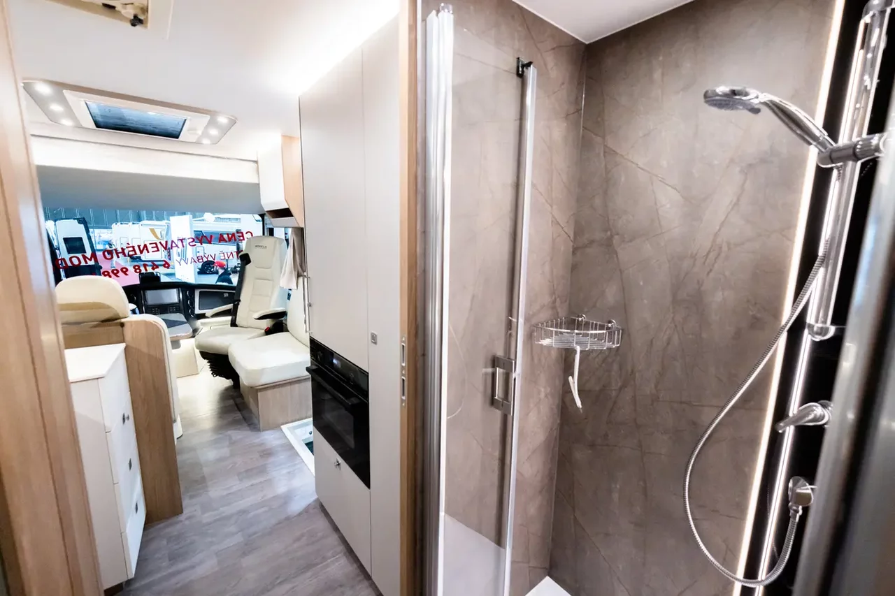 Model Morelo Home 82M měří přes 8 metrů, nabízí komfort pro čtyři osoby a je vybaven velkou keramickou toaletou, prostornou garáží pro dvě kola a chytrým systémem hospodaření s vodou – 240 litrů čisté, 200 litrů odpadní a 200 litrů fekální. Díky zadním měchům a výkonnému topení poskytuje dokonalé pohodlí i mimo kemp.