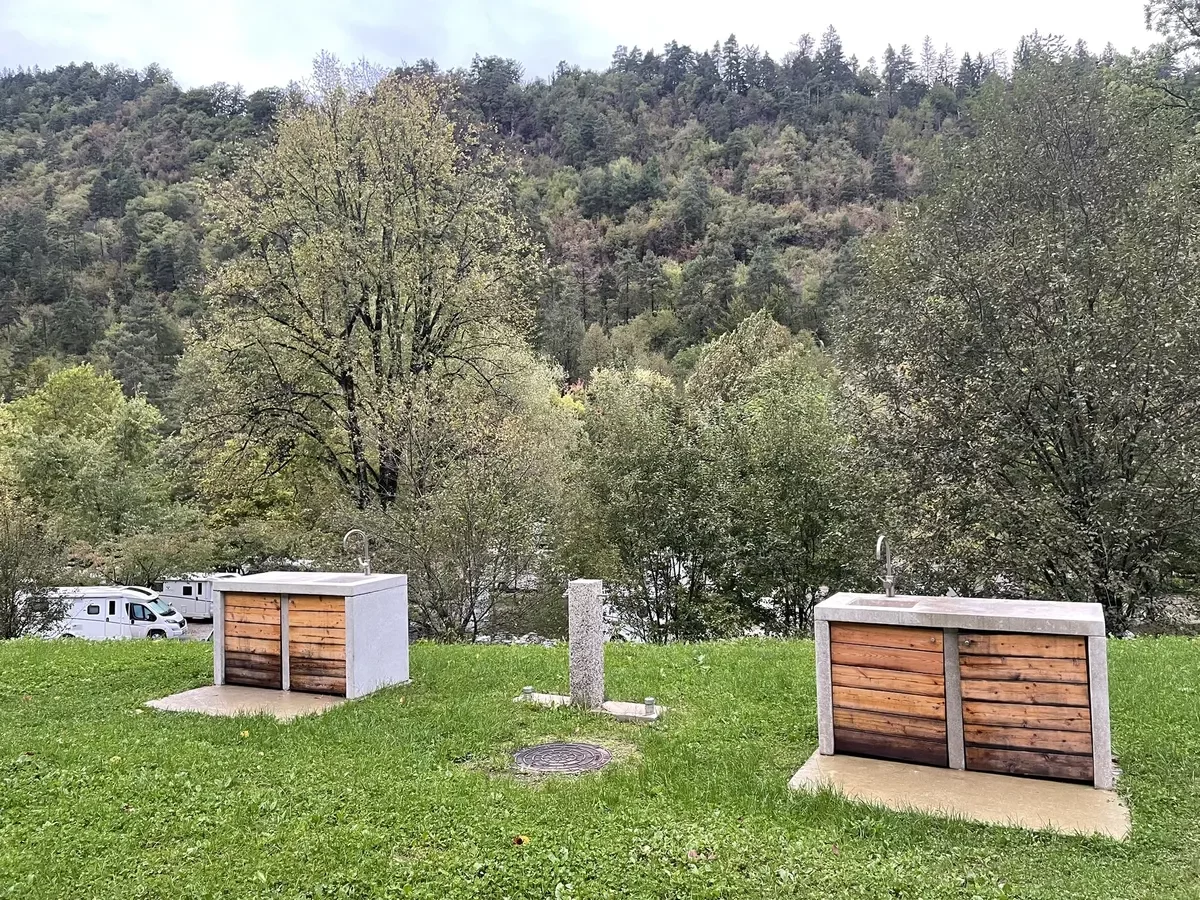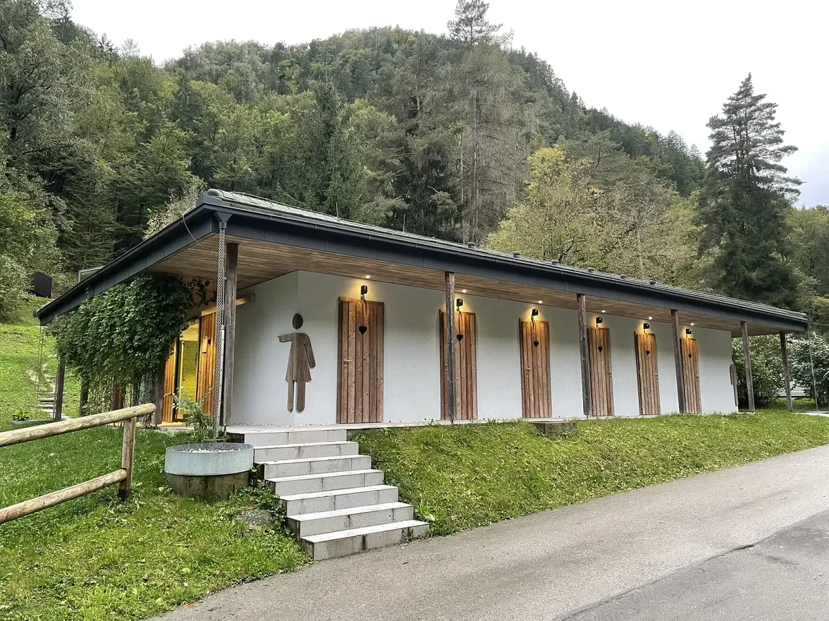 Jak to funguje? Na recepci obdržíte kliček. Soukromé koupelny se nachází v nově vybudované budově. Za dřevěnými dveřmi karavanistu čeká prostorná vytápěná místnost s umyvadlem, sprchovým koutem a WC. Žádná umrněná hotelovou koupelna, ale plnotučná záležitost. Vše ve vkusné kombinaci světlého dřeva a tmavé rustikální dlažby. Kempovali jsme tady na podzim minulého roku a musím říct, že po vydatné horké sprše se člověku z ven z privátních “spa” vůbec nechce. Možná to souvisí s tím, že prostor byl vytápěný.