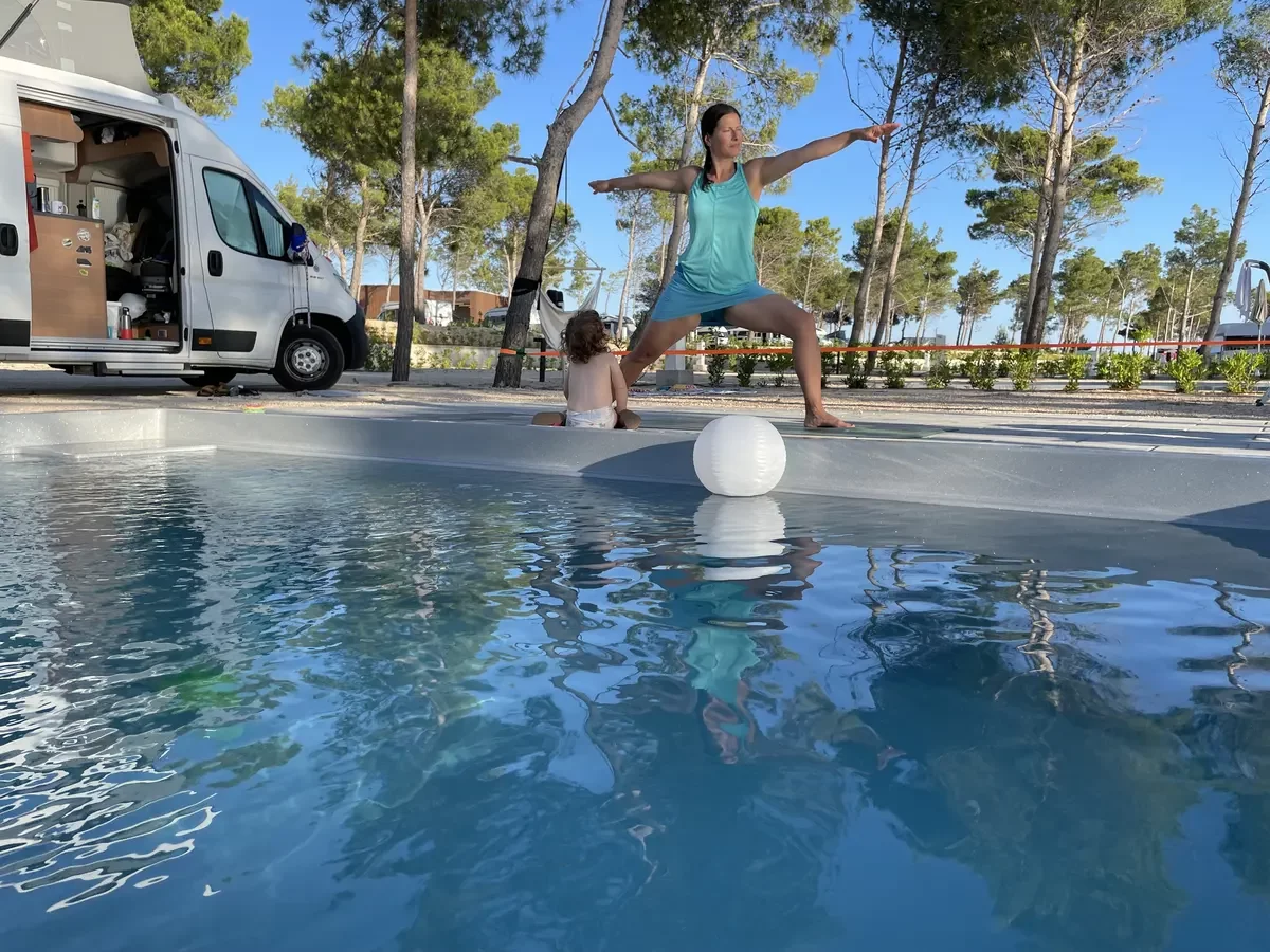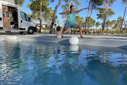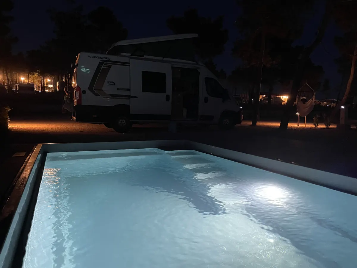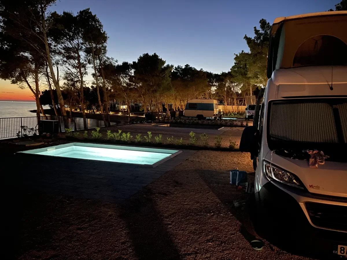 V první linii nechali architekti postavit řadu malých bazénů. Každý obytný vůz na prémiovém stání tak má dispozici vlastní koupání se sladkou vodou, kterou je navíc možné vyhřívat pomocí tepelného čerpadla. Při našem příjezdu těsně po otevření nového kempu přišel gentleman z údržby a pečlivě se nás vyptával, na jakou teplotu chceme privátní bazén vyhřívat. K jeho údivu jsme řekli, ať nechá tepelné čerpadlo vypnuté. Voda se nám zdála teplá i bez ohřevu. Každý den se pak k bazénu dostavil někdo z personálu, aby jej ručně vyčistil od napadaných nečistot.