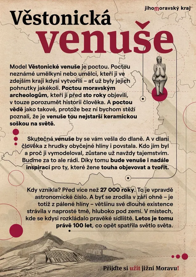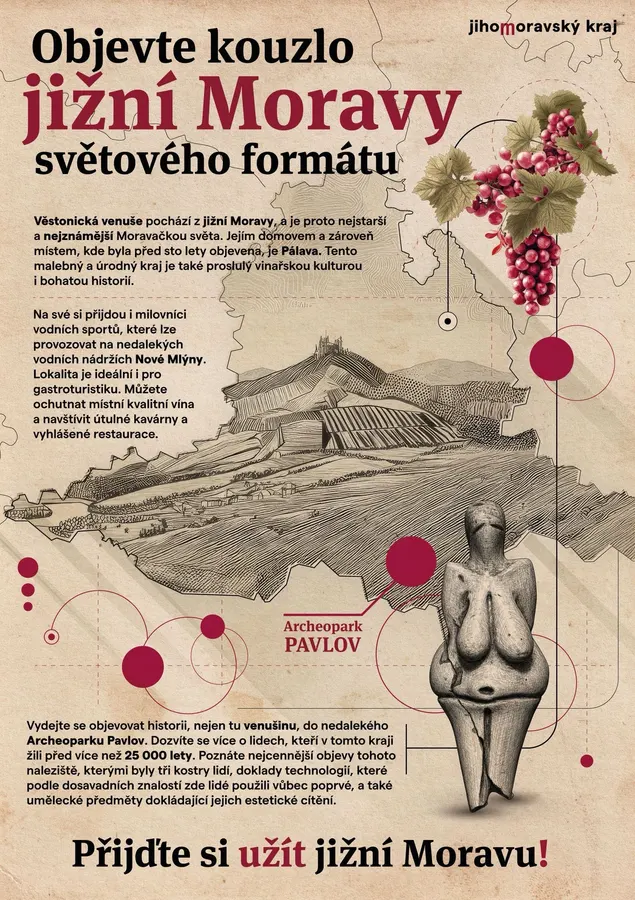 Přijďte se podívat na Věstonickou venuši a nechte se inspirovat k výletu po stopách pravěku, vína a jižanské pohody. Jižní Morava světového formátu čeká právě na vás!