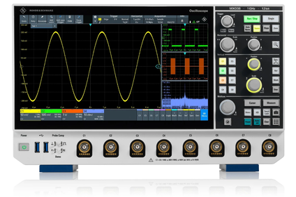 The Rohde & Schwarz MXO38 oscilloscope offers 8 channels, a bandwidth of up to 1 GHz and a record refresh rate of over 4.5 million waveforms per second, which captures even the rarest anomalies. With a 12-bit ADC and low noise, it provides unmatched display accuracy, while the large memory and 12” touch screen guarantee maximum comfort when analyzing complex signals.
