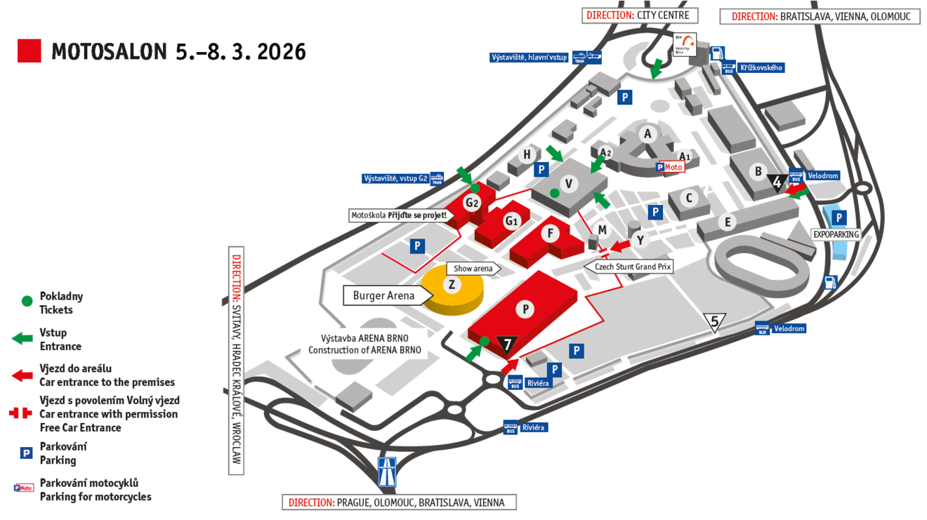 For motorcycles, secured parking is reserved near Pavilion Y and in section A1 with free parking (entry via Gate 4).