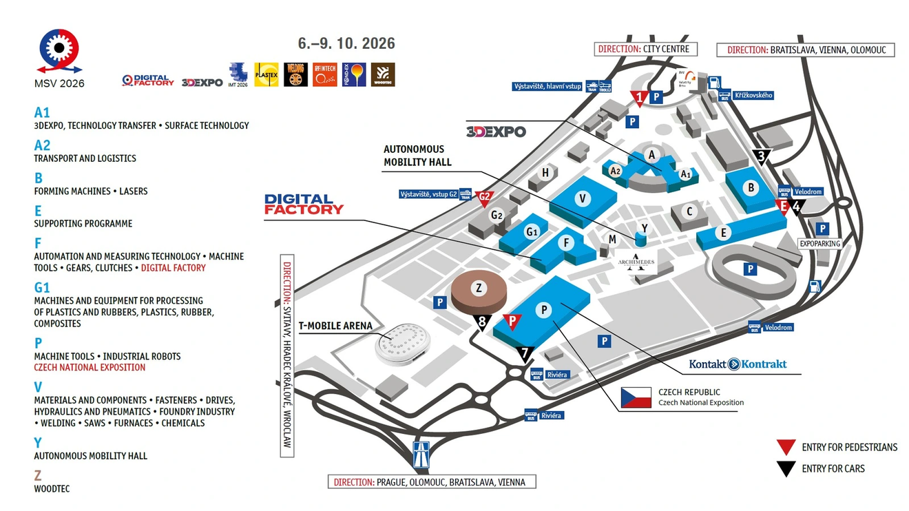 For entry with your car please use gate 3 or gate 8. It´s also possible to use Expoparking building (Křížkovského 51).