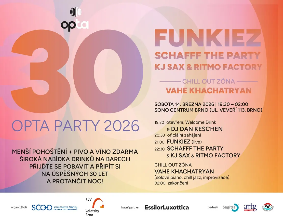 Saturday evening at the OPTA fair will traditionally be dedicated to a joint gathering of exhibitors, partners, and visitors. The OPTA Party will take place on Saturday, 14 March, from 19:30 to 02:00 at the SONO Music Club in Brno, offering an evening full of music, a great atmosphere, and informal networking. The evening program is prepared in cooperation with the Association of Czech Opticians and Optometrists (SČOO).