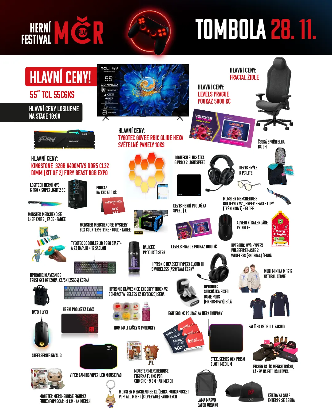 Páteční program herního festivalu MČR zpestří velká tombola plná hodnotných cen. Losování proběhne v 18:00 na hlavní stage v pavilonu P a výherci se mohou těšit na kombinaci prémiové elektroniky, herního příslušenství, voucherů i tematických dárků. Tombola tak každoročně patří k nejoblíbenějším částem celého dne a letos je nabitá opravdu atraktivními výhrami.