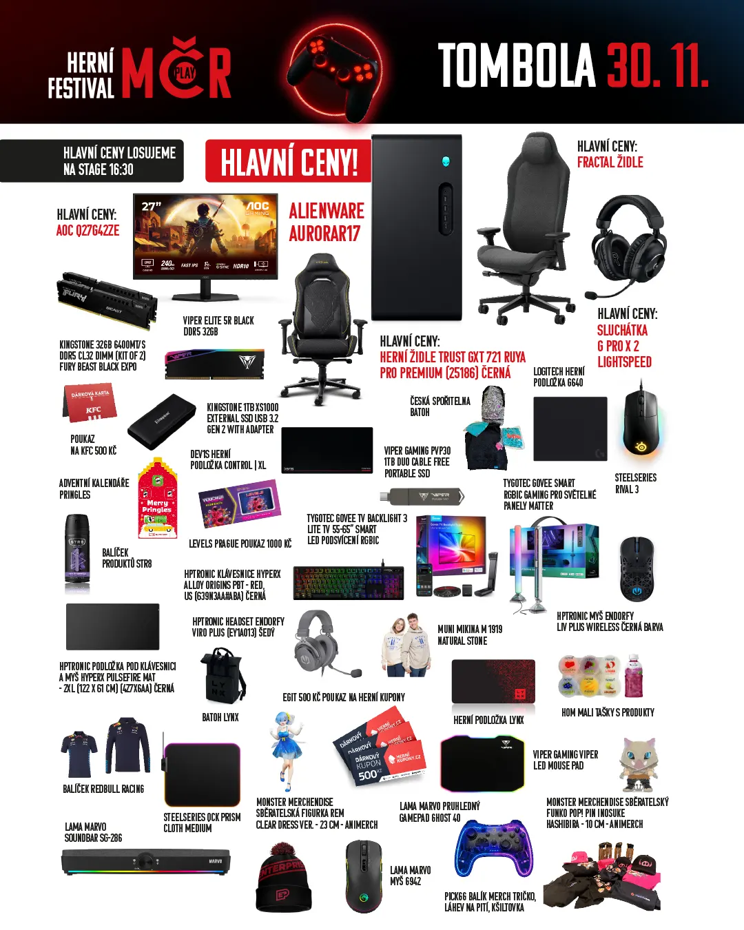 Neděle uzavírá Herní festival MČR velkolepou tombolou, která přináší další nadupanou nadílku cen. Losování proběhne v 16:30 na hlavní stage a návštěvníci se mohou těšit na široký výběr techniky, herního příslušenství i tematických balíčků. Nedělní tombola tradičně uzavírá celý festival a letos je opět nabitá výhrami, které potěší hráče i sběratele.