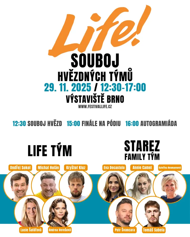 Diváky čeká show plná energie, napětí a nečekaných zvratů, v níž se slavní odhalí nejen jako soupeři, ale i jako týmoví hráči. Souboj týmů je už tradičně symbolem dobré nálady, přátelství a radosti z pohybu – přesně tak, jak se na festival Life! sluší.