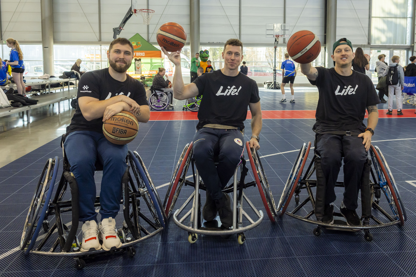 Hned prvním zastavením byl basketbal na vozíčcích v režii Hobit Brno. Tři profesionální sportovci rychle pochopili, že manipulace s vozíkem a práce s míčem je úplně jiný svět, než na jaký jsou zvyklí. „Obrovský respekt,“ shodli se po pár minutách. Nešlo jen o sílu v rukou, ale i o koordinaci, techniku a čtení hry v úplně nové pozici. Děti, které je sledovaly, nadšeně tleskaly – vidět své idoly v roli začátečníků bylo skoro stejně inspirativní jako samotný sport.