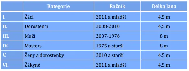 „Závod je nominační pro mistrovství České republiky 2026. Jedná se tedy o první závod další sezóny,“ řekl ředitel soutěže Robert Šimík. Vedle toho bude také závod základních a středních škol ve šplhu. Závodí se ve šplhu na laně bez přírazu do výšky 4,5 m pro kategorii žáků a dorostenců a na laně výšky 8 m pro kategorii muži a senioři.