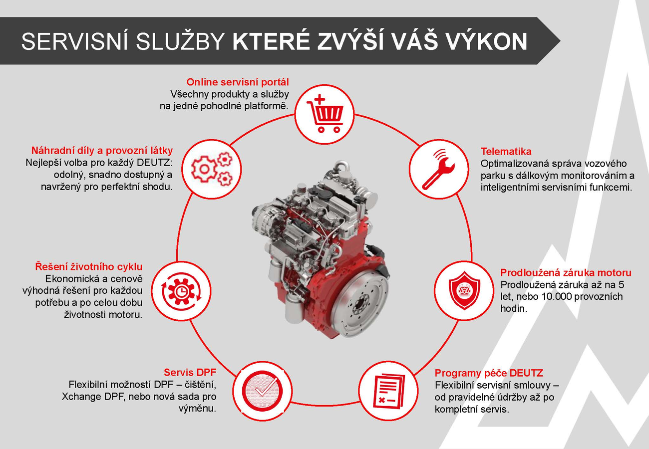 Nedílnou součástí nabídky je DEUTZ Service, který klade důraz na maximální dostupnost strojů a zařízení. Díky rozsáhlé globální servisní síti poskytuje rychlou, odbornou a spolehlivou podporu v každé situaci. Cílem je jediné – zajistit, aby stroje zákazníků byly vždy připraveny k provozu a mohly pracovat bez zbytečných prostojů.