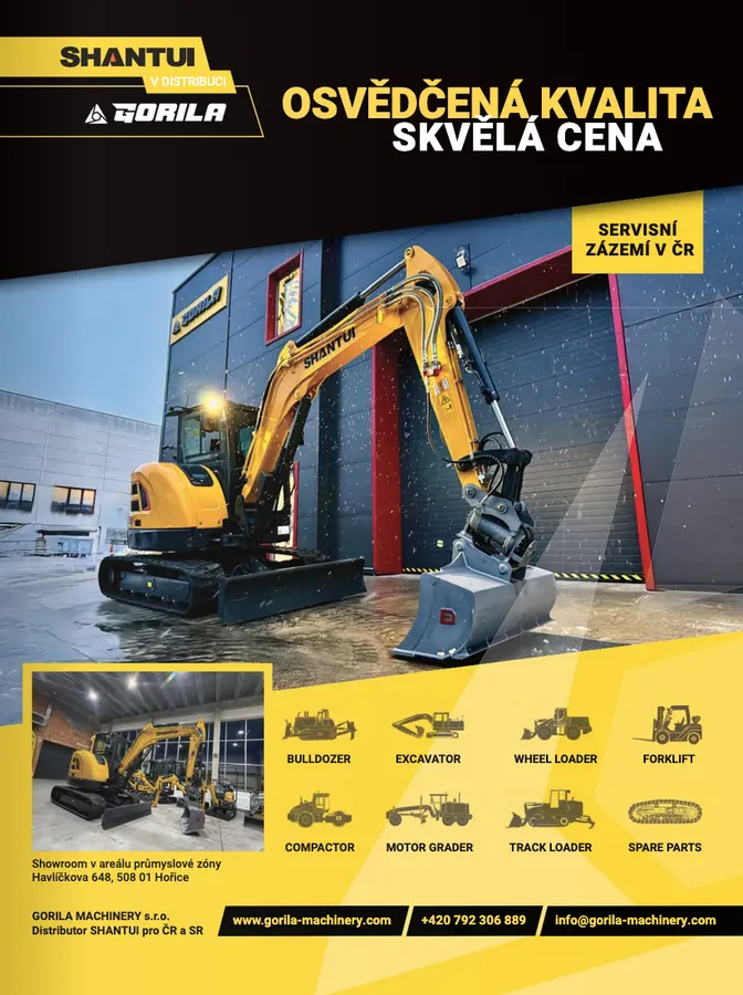 Otevírá se tak významná příležitost pro stavební firmy — zejména ty, které nakupují techniku ve větším rozsahu a hledají výhodný poměr ceny a kvality, spolehlivého partnera pro distribuci i servis. Vstup na nový trh je spojen s atraktivními cenovými podmínkami. GORILA MACHINERY otevřela pro zájemce o stroje SHANTUI nový showroom a servisní zázemí v Hořicích nedaleko Hradce Králové. Vybraný sortiment nejoblíbenějších minibagrů ale i velkých stavebních barů je již dnes skladem v dostatečném objemu. Dodací lhůta pro ostatní stroje činí standardně 1 týden až 3 měsíce od objednávky.
