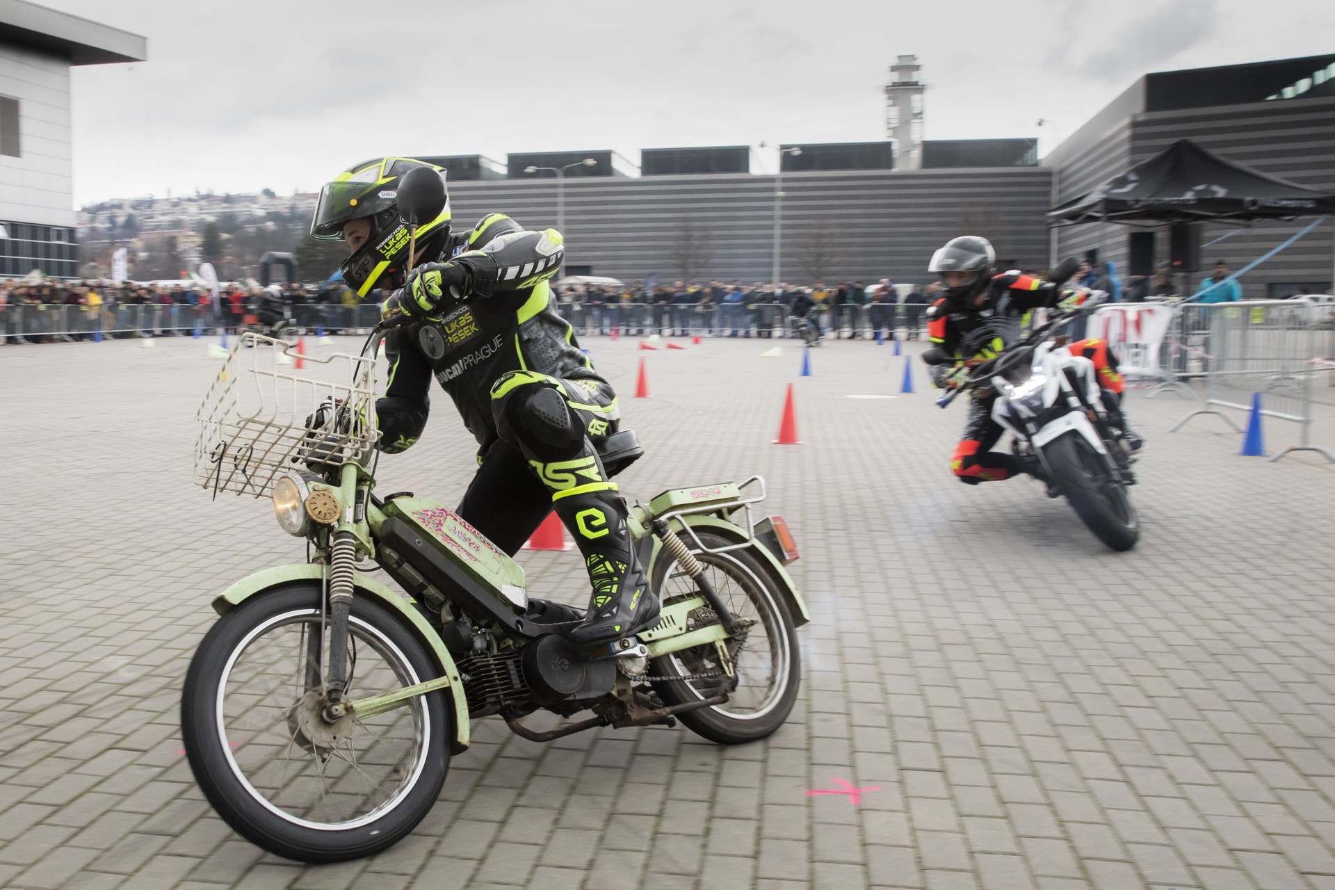 Po krátkém a vtipném úvodu na pódiu se všichni účastníci za doprovodu davu lidí přesunuli do venkovní arény Moto Gymkhany, kde byl pro ně připraven speciální okruh. Trať vytyčenou barevnými kužely měli projet patnáctkrát, celou akci vtipně komentoval Maty Landa a diváci si tuhle legraci užívali. Některým protagonistům při závodě Babetta takzvaně zdechla, takže si pěkně šlápli do pedálů. Nejkorektněji a nejrychleji trať projížděl Míra Lisý a jako druhý byl vyhlášen Martin Písařík – za snahu trefit se mezi kužely.