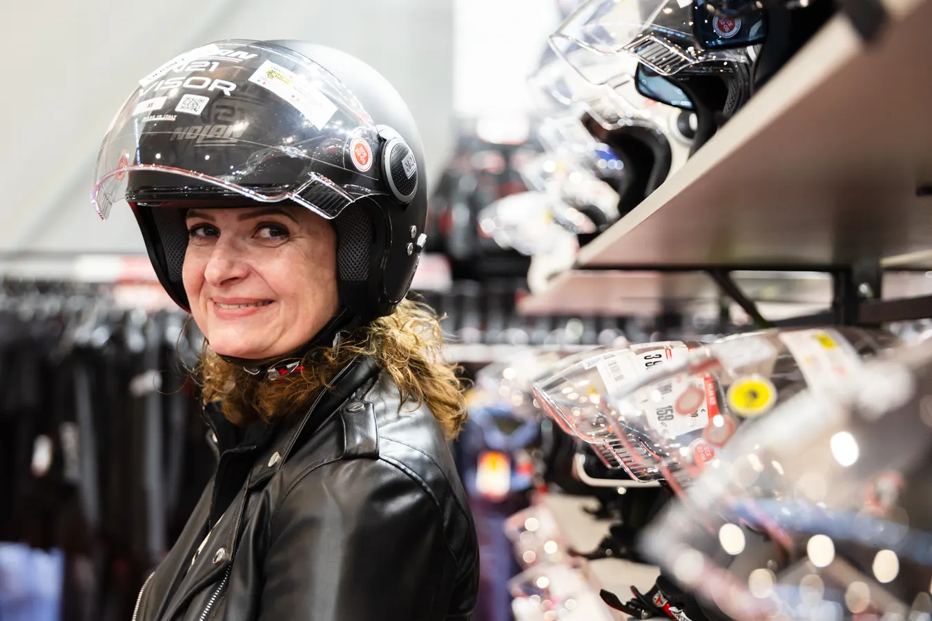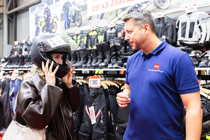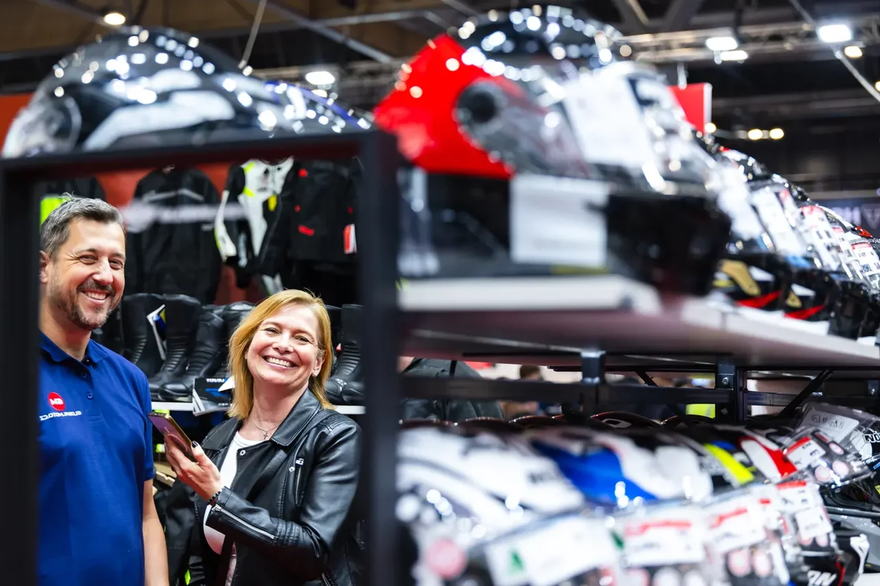 Helmy ale nejsou jediným tahákem. Součástí stánku je i česká značka oblečení Spark. „Je to vývoj pro české motorkáře, české proporce i naše klimatické podmínky,“ říká Michal Hrabák. Kolekce zahrnuje lehké letní bundy i plně vybavené cestovní modely s možností odepínání vrstev, dostatkem kapes a výbavou pro delší výpravy – klidně přes Alpy nebo do Rumunska. Na své si přijdou i ženy. Barevné varianty jsou navržené tak, aby se daly kombinovat s pánskými modely. „Spousta párů chce jezdit sladěná, aby motorka i posádka působily jako celek,“ usmívá se Michal Hrabák.