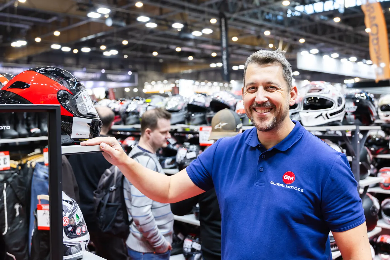 Stánek společnosti Global Moto patří na Motosalonu k těm, které zkrátka nepřehlédnete. Stačí se rozhlédnout – kam se podíváte, tam je helma. A ne ledajaká. „Chceme se prezentovat hlavně jako specialista na přilby. Výběr, který tady máme, jinde v Česku prakticky nenajdete,“ říká Michal Hrabák z Global Moto.