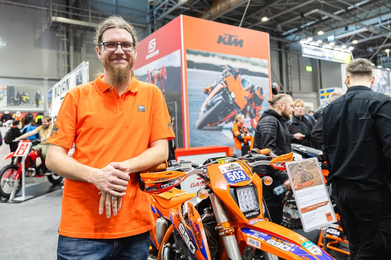 Stánek KTM letos patří k nejvýraznějším na celém Motosalonu. Autorizovaný dealer KTM Autonova Brno přivezl nejen sériové modely, ale i několik skutečných závodních klenotů. O expozici mluví Jakub Bumba. „Přivezli jsme jak motorky ze sériové produkce, tak i pár závodních speciálů. Chtěli jsme, aby si tady každý našel to svoje,“ říká.