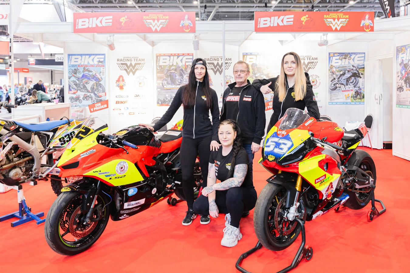 Na stánku návštěvníci našli aktuální produkci magazínu, merchandising a také společnou expozici s týmem Wonder Woman Racing, se kterým Motorbike dlouhodobě spolupracuje. Nechyběly závodní stroje, možnost společného focení ani osobní setkání s členkami týmu – další důkaz, že ženský element má v Motorbike pevné místo.