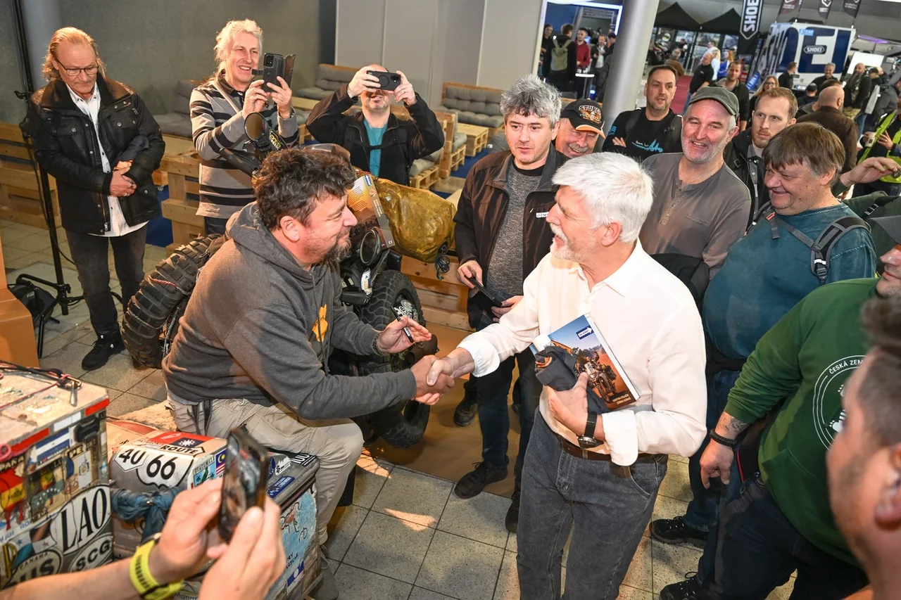 I další dlouhá zastávka souvisí s terénem a cestováním, prezident s přáteli totiž před rokem absolvoval jako fotograf část trasy Rally Dakar v Saudské Arábii. Na stánku s motocykly a doprovodným kamionem týmu MGR Racing. Když se zaposloucháte do společných historek, najednou jde oficiální tón a uctivý odstup stranou a baví se mezi sebou jen nadšení motorkáři. To se opakovalo i u vystavené motorky dlouholetého dakaristy Davida Pabišky v expozici sítě prodejen s motocyklovým vybavením Bikers Crown.