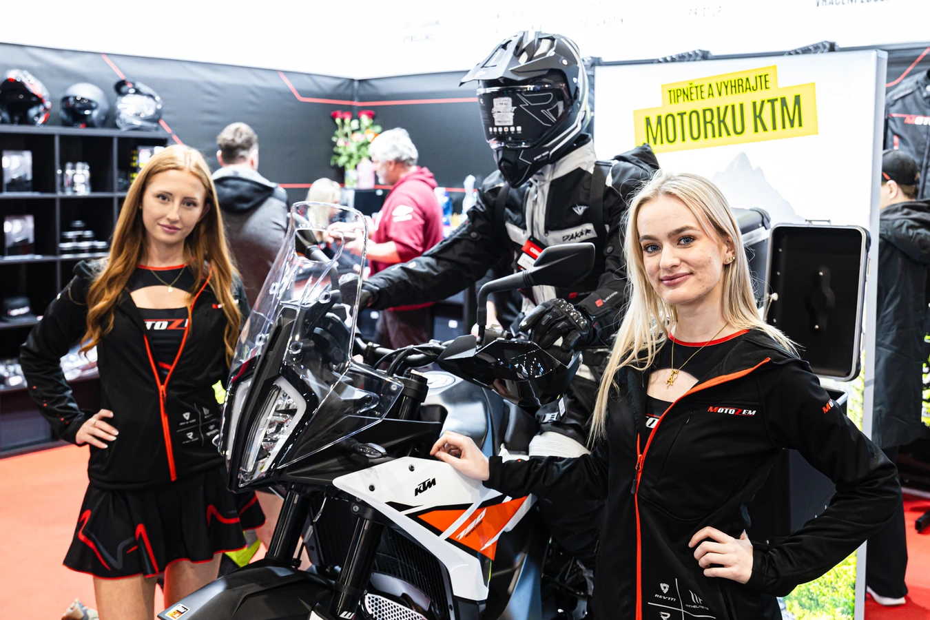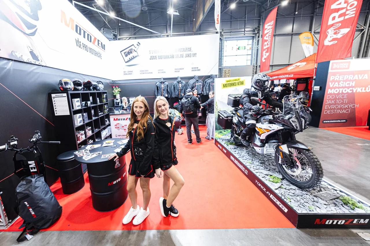 Víc nám k tomu prozradil marketingový zástupce Motozem, pan Kryštof Uruba: „V naší expozici jsme se soustředili jen na naše obrandované oblečení oblečení a pár vzorků námi vyráběných značek Street Racer a RSA. Pro návštěvníky jsme připravili lákavou soutěž, ve které mohou vyhrát novou motorku. Soutěží se zde na výstavě, ale zúčastnit se lze i na našem webu. A podmínka? Tipněte si správně, kolik kusů čistících ubrousků MotoZem se vejde do 3 kufrů KTM Touratech. Správný odhad zvýší šanci na úplně novou motorku KTM 790 Adventure s kovovými kufry v hodnotě 300 000 Kč.“