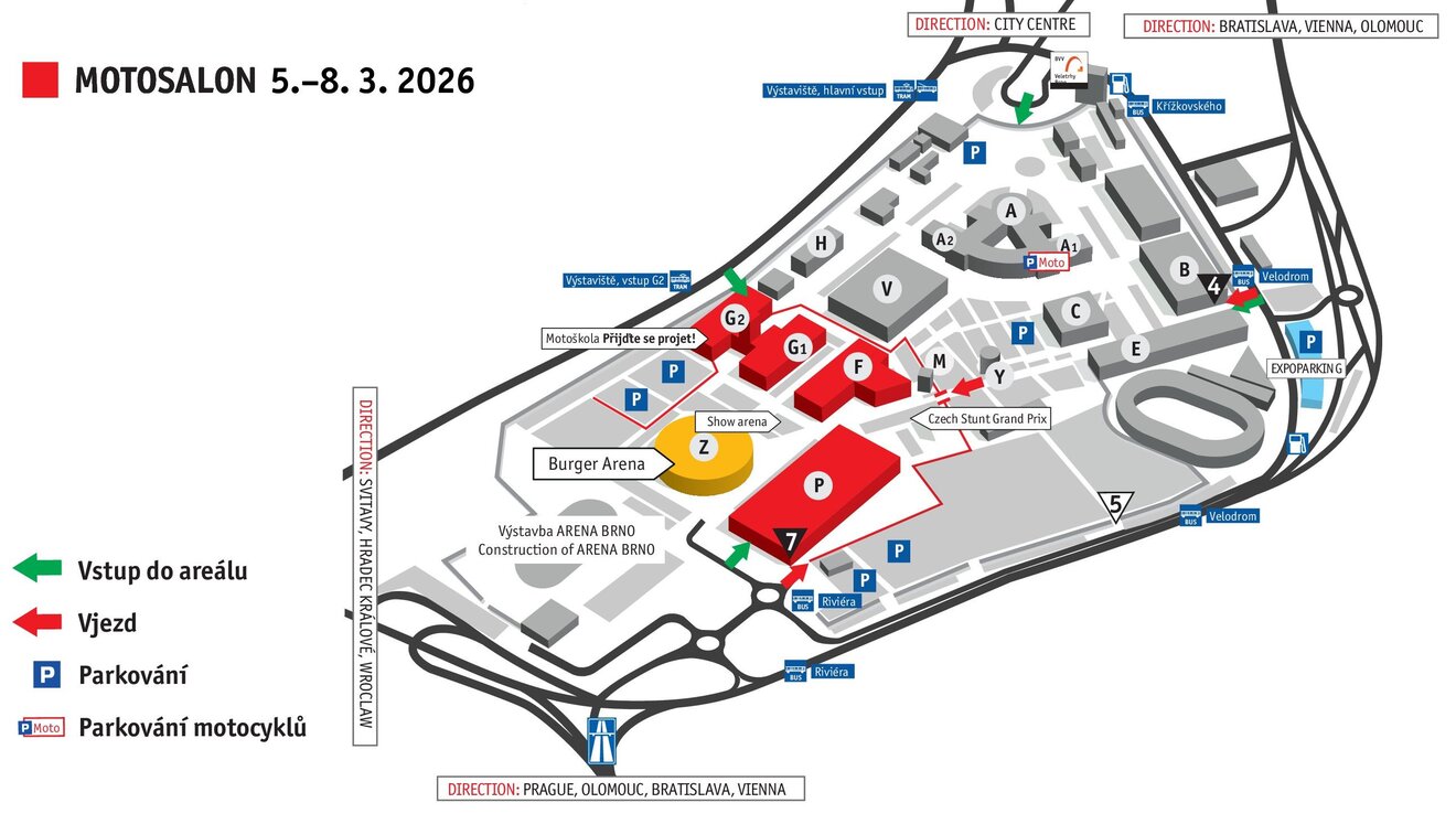 Pro motocykly je vyhrazeno hlídané parkoviště u pav. Y a na ploše A1 s bezplatným parkováním (vjezd branou 4).