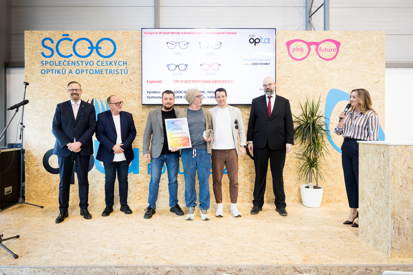 V nejobsazenější kategorii Brýlové obruby a sluneční brýle – technologické inovace porota udělila dvě ceny. Italský výrobce a vystavovatel LOOK OCCHIALI SRL byl oceněn za exponát TRI-X ACETATE (mod.5443.52.C4), a to konkrétně za technologické řešení obruby spojené ze tří různých materiálů. Přední část je vyrobena z acetátu, stranice jsou z oceli a uzavírací systém je z polymeru. Obruba navíc umožňuje snadnou výměnu stranic, a tím proměnu designu obrub.