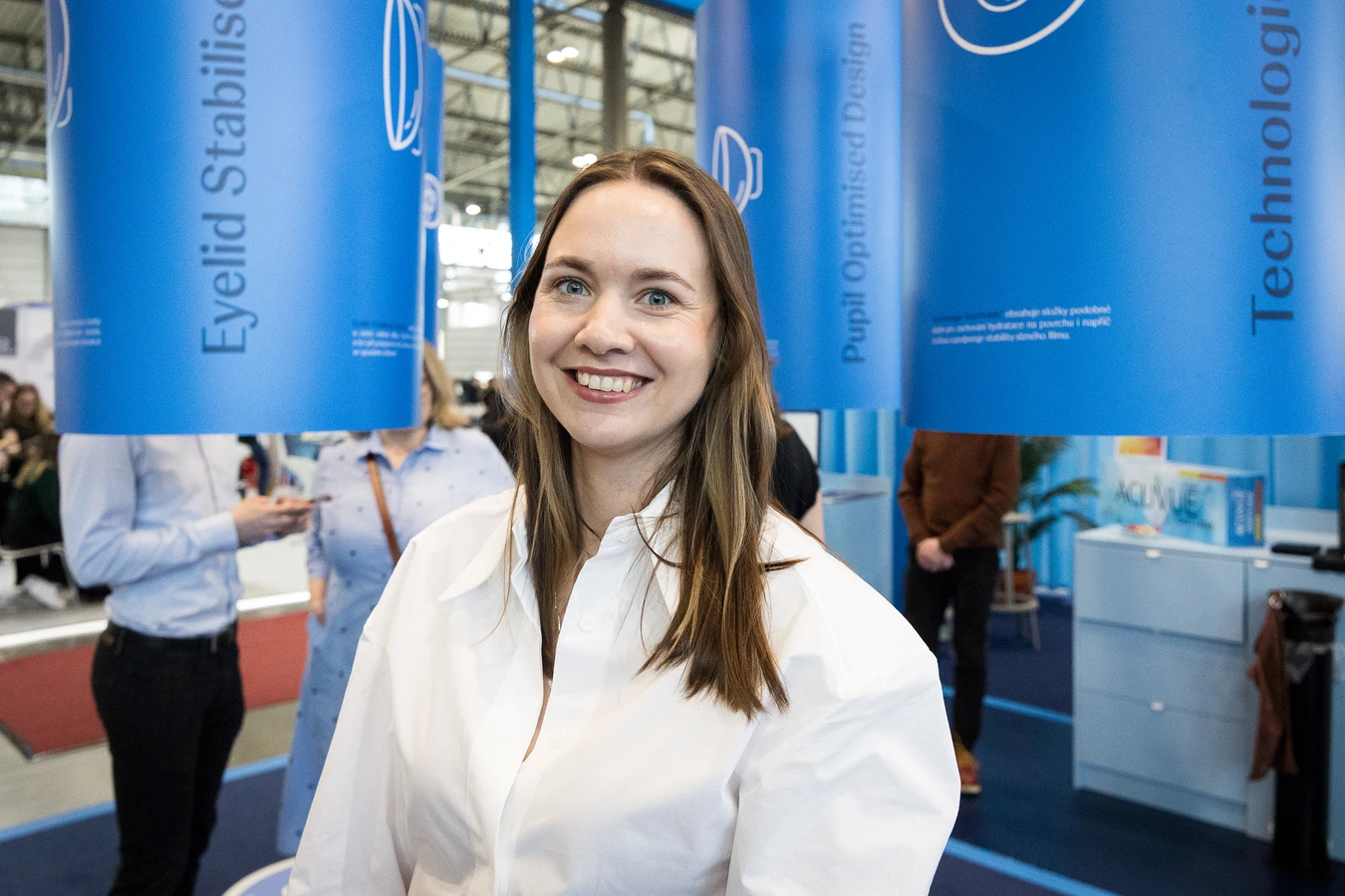 Hlavním mottem stánku bylo Naslouchání očím. V jeho přední části návštěvníky zaujaly čtyři výrazné tubusy, které symbolizovaly konkrétní problémy očí a zároveň technologie, jež je řeší. „V každém tubusu si odborníci mohli poslechnout, jaké problémy oči trápí a jak je naše technologie řeší,“ vysvětluje Jana Filipská. Každý tubus byl věnován jedné unikátní technologii – od stabilizace čočky přes filtraci světla až po podporu hydratace.