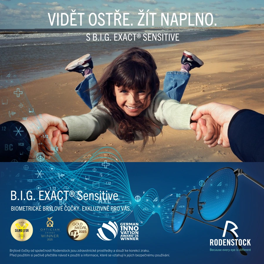 Společnost Rodenstock rozšiřuje portfolio biometrických čoček B.I.G. EXACT® Sensitive, které jsou nyní dostupné napříč celou produktovou řadou – od jednoohniskových až po progresivní varianty. Jde o první čočky na světě optimalizované nejen podle jedinečné biometrie oka, ale také podle individuální zrakové sensitivity, tedy způsobu, jakým mozek zpracovává vizuální informace.