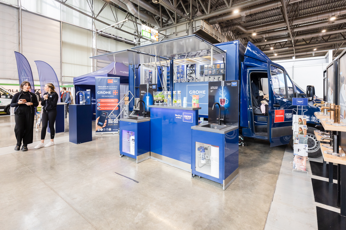Expozice značky Grohe představuje moderní koupelnová řešení v netradičním formátu. Místo velkého kamionu letos vsadila na kompaktnější prezentaci, která však nabízí kompletní průřez portfoliem.