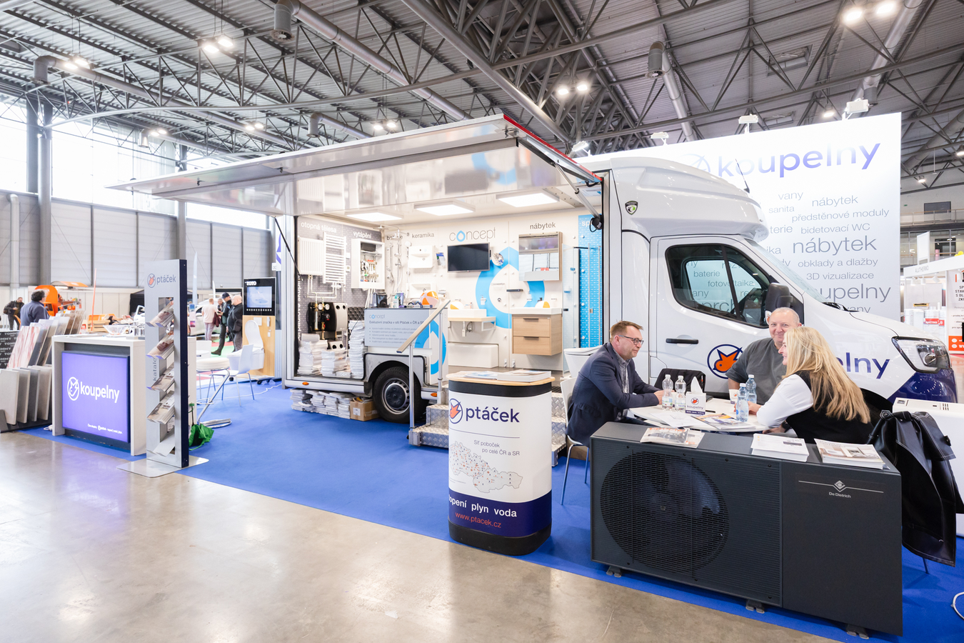 „Návštěvníci u nás najdou kompletní průřez sortimentem. Nejsme jen koupelny – řešíme vytápění, fotovoltaiku, klimatizace, vzduchotechniku i inženýrské sítě. V podstatě všechno, co souvisí s vodou a technologií domu,“ vysvětluje Michal Synek. Expozice je koncipována tak, aby návštěvníkům přiblížila celý rozsah nabídky. „Máme tady i karavan, kde prezentujeme konkrétní produkty – od tepelných čerpadel přes krby až po další technologie,“ doplňuje.