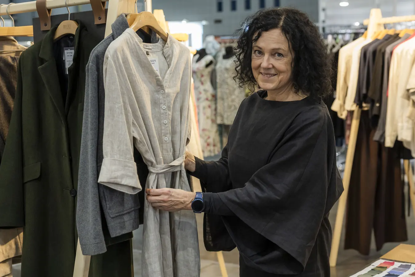 Na expozici najdeme šaty, pláště, kalhoty i halenky. Co je letos hitem u zákazníků? „Vedle tradičních střihů šatů se nám dobře prodává kapsulový vzhled, tedy kalhoty, top, přes to blazer, sáčko či bundička,“ doplňuje majitelka prostějovské firmy.